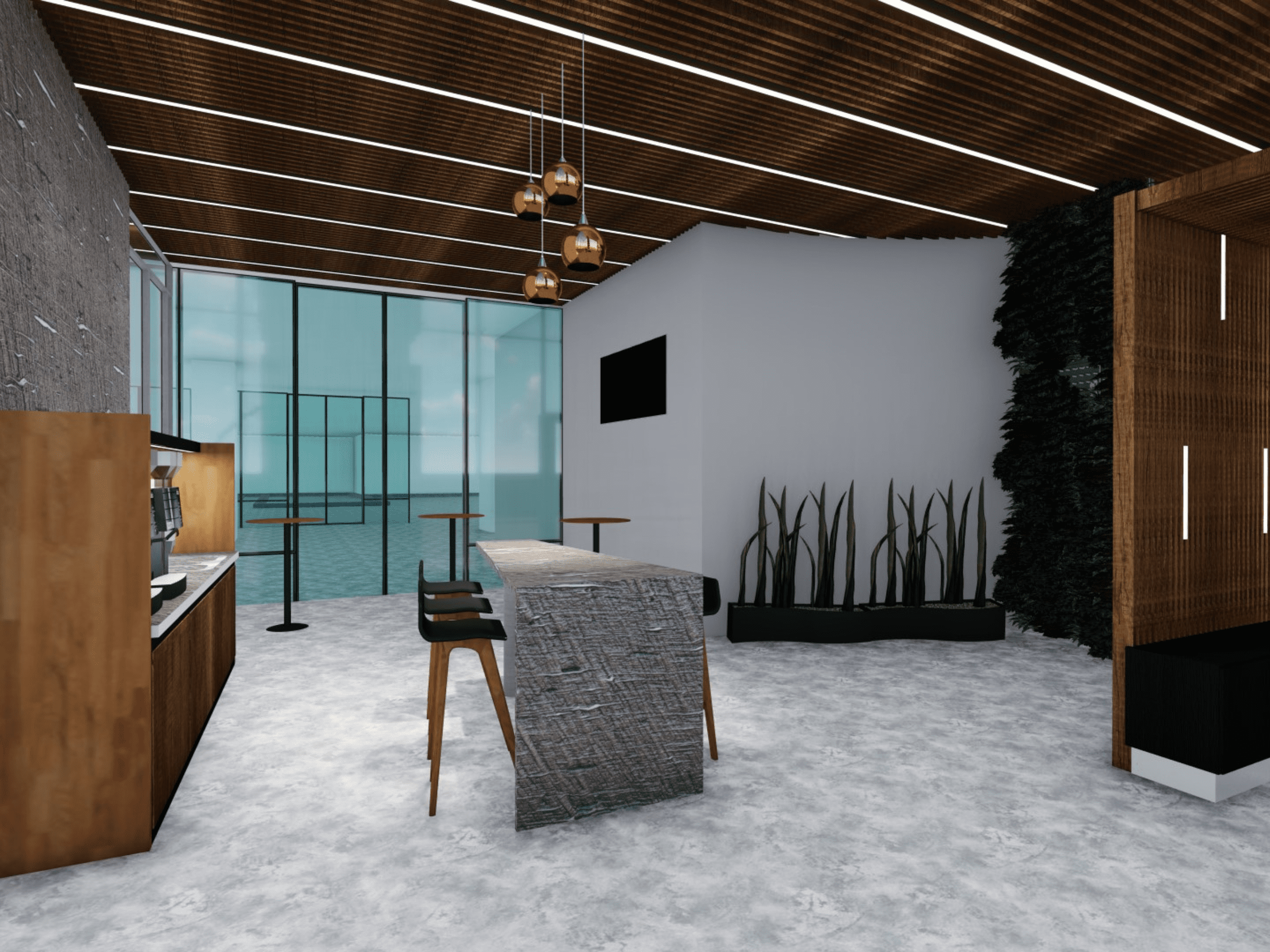Una de las áreas importantes en cuanto la recepción del visitante es el lobby con altura imponente de 11 m, en el cual se han creado áreas de espera, counter de recepción, control del sistema de seguridad, área de cafetería con espacio de coworking, baterías sanitarias, acceso controlado al núcleo de circulación vertical.